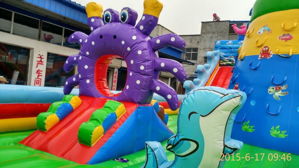 充气城堡采用的原材料供应商,0.45mm一等加厚,环保型PVC材料。的设计人员生产工艺:下料,缝纫(热合),粘整(美化),成品。尽可能多的使用双明线缝制,线迹均匀,针距控制在4.2到4.5mm之间。(能够大限度的减少漏气和增加缝纫部位的垃圾强度。)粘整刷胶宽度与粘条的宽度误差不超过正负0.5cm。造型与大面连接处大限度地采用弧线结构。目的是使产品的受力均匀,增加产品的使用寿命。每两个造型之间和造型与护栏之间都有一定的安全距离。(1米)产品造型逼真,颜色搭配美观。而且能够充分保证游玩者的安全。